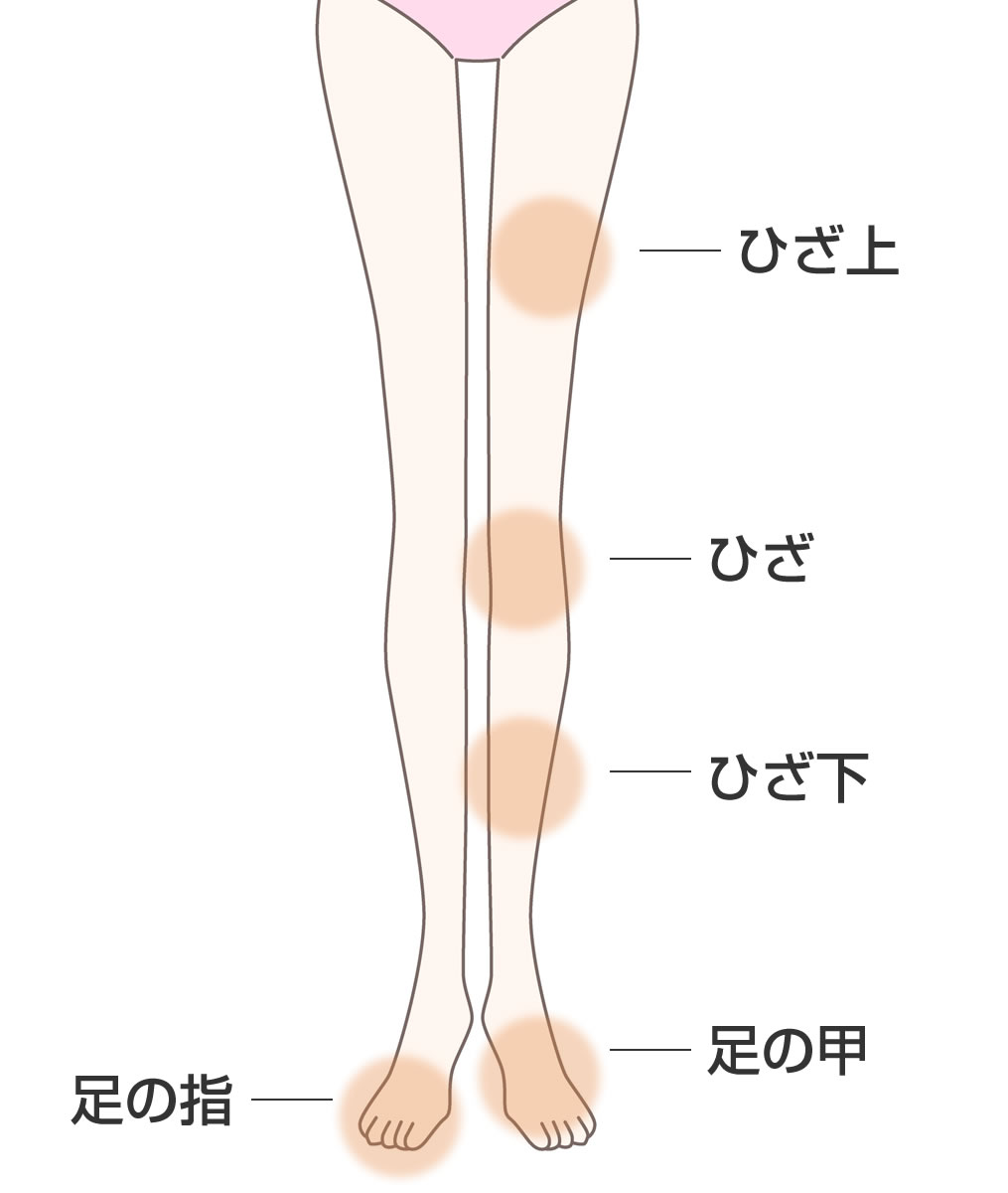 ①ひざ上 ②ひざ下 ③ひざ ④足の甲 ⑤足の指