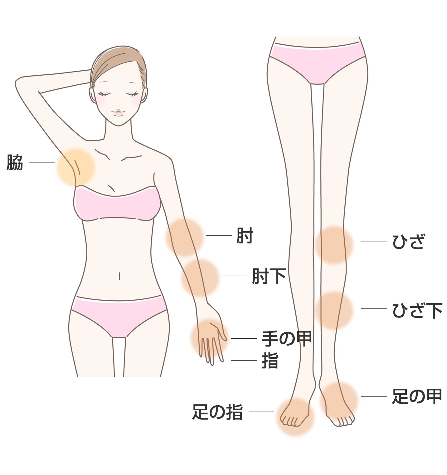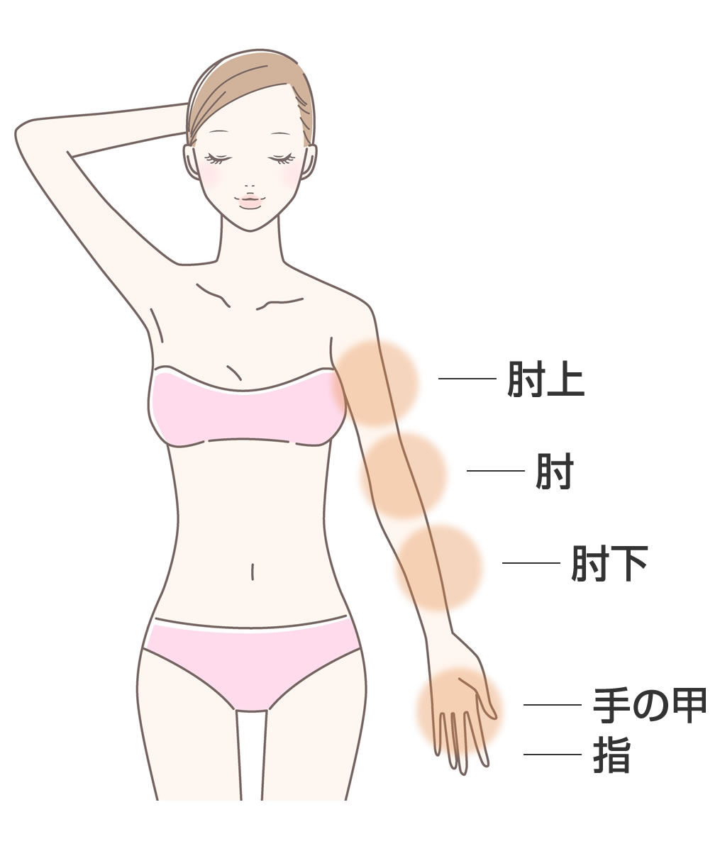 ①わき ②肘下 ③肘 ④ひざ ⑤ひざ下 ⑥足の甲、指 ⑦手の甲、指